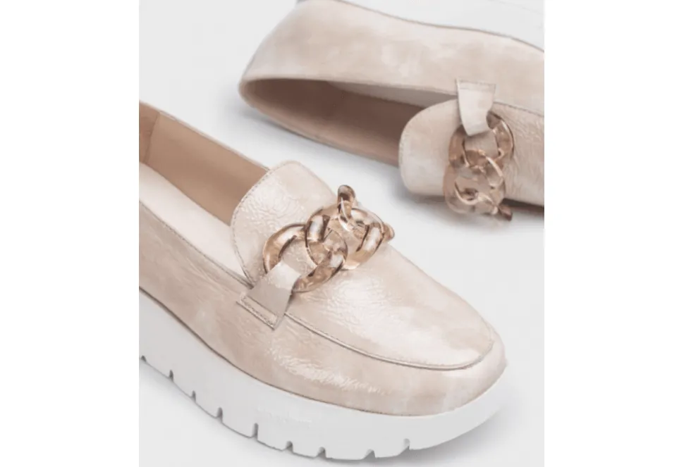 The A-2405 Chain Loafer Is The Must Have Ladies Shoe By Wonders! The A-2405 Is A Platform Loafer Featuring A Stunning Chain Design. Theses Chic Platforms Feature An Ergonomic Design And Have Been Crafted With Style And Comfort In Mind. The A-2405 Is Incredibly Lightweight And Features A Leather Upper, Wondersfly Technology And A Microfibre Sole. We Have The A-2405 Available In Taupe Patent.