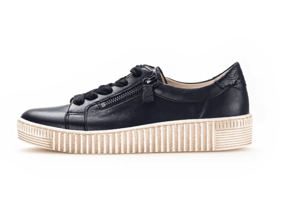 The Wisdom Trainer By Gabor Is A Stylish And Comfortable Casual Trainer. The Trainer Has Zip Fastenings On Either Side Of The Shoe And A Lace Up Front. The Sole Is Platformed And Provides A Great Height And A Secure Fit. The Marine Colour Is Stunning And Reflects The Ss24 Trends Perfectly.