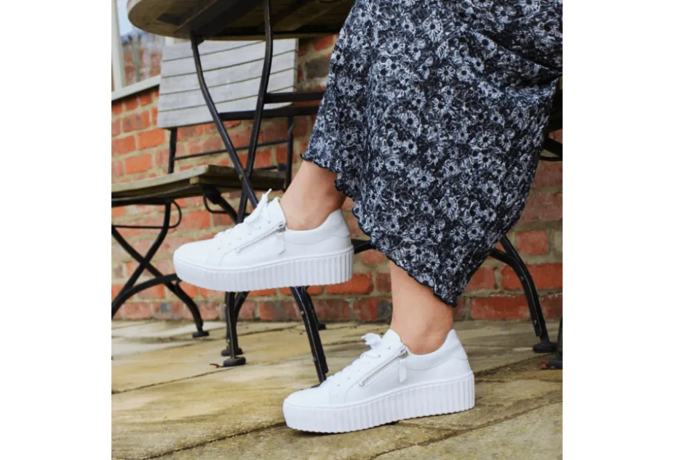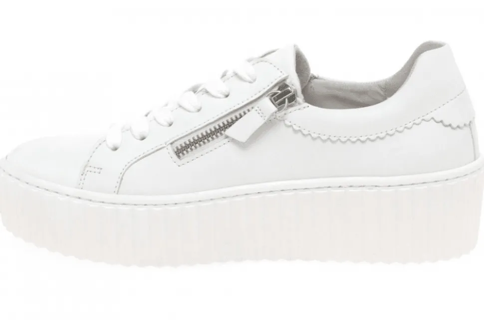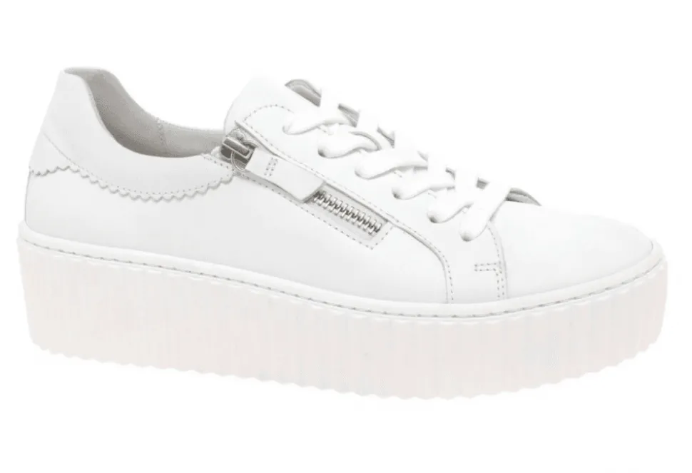 The Dolly Is An On Trend Ladies Trainer By Gabor. The Dolly Features A Platform Sole Unit And Stitch Detailing For A Unique And Versatile Style. The Dolly Also Features Adjustable Laces And A Zip Fastening For A Secure Fit. The Platform And Stunning White Upper Enables This Trainer To Be Extremely On Trend This Year!