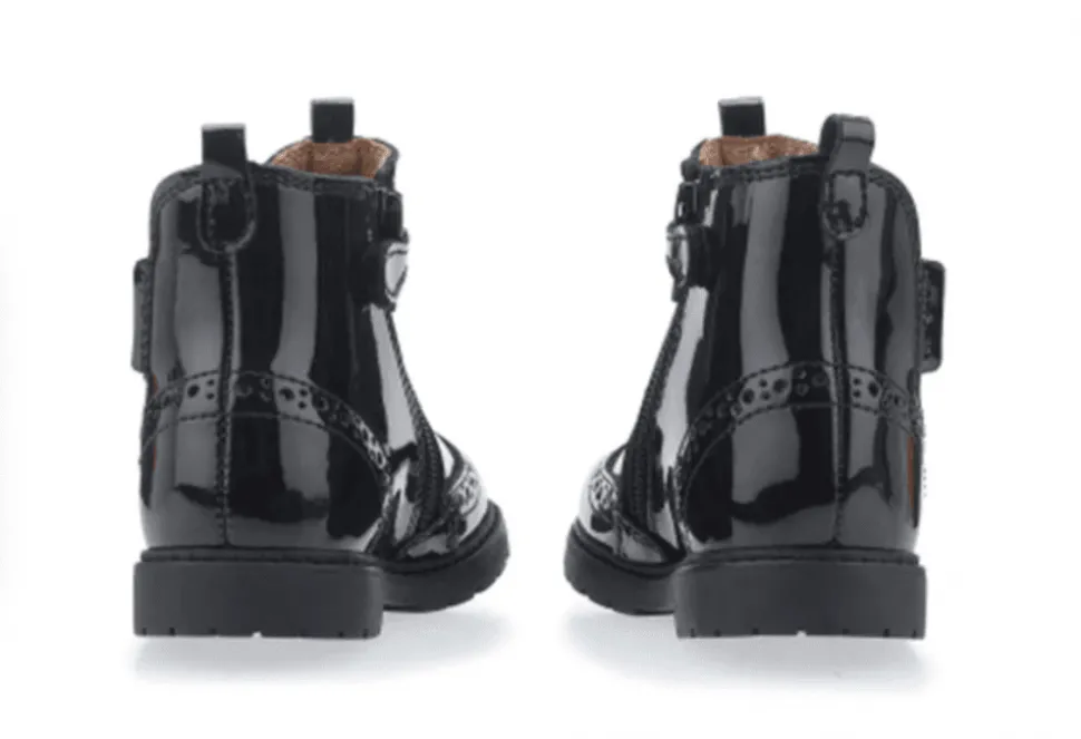 The Chelsea Is Patent Chelsea Boot For Girls. This Boot Has Brogue Detailing And A Patent Finish And Is A Staple Girls Wardrobe Piece. Features Side Zip Fastening And Elastic Side For Slipping On/Off With Ease. Leather Linings Allow Feet To Stay Fresh. Flexible, Durable Sole On A Boot That Lasts.