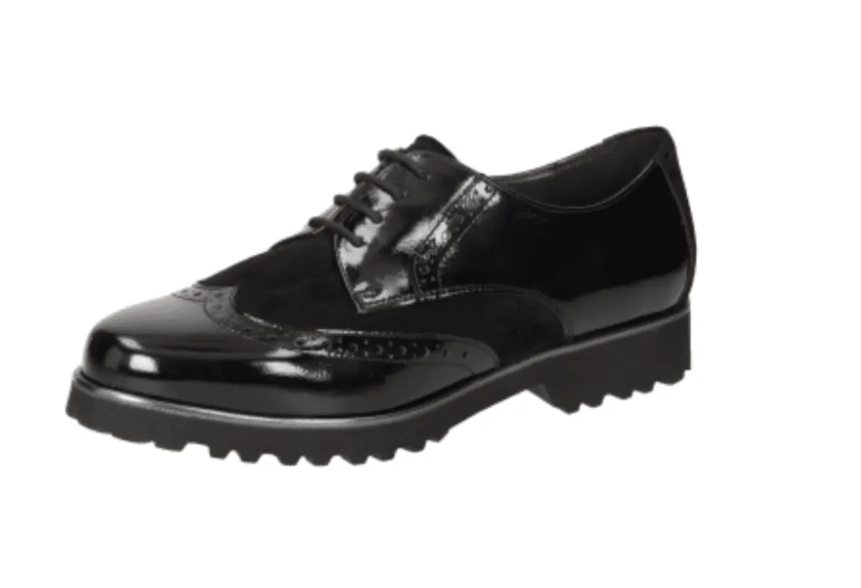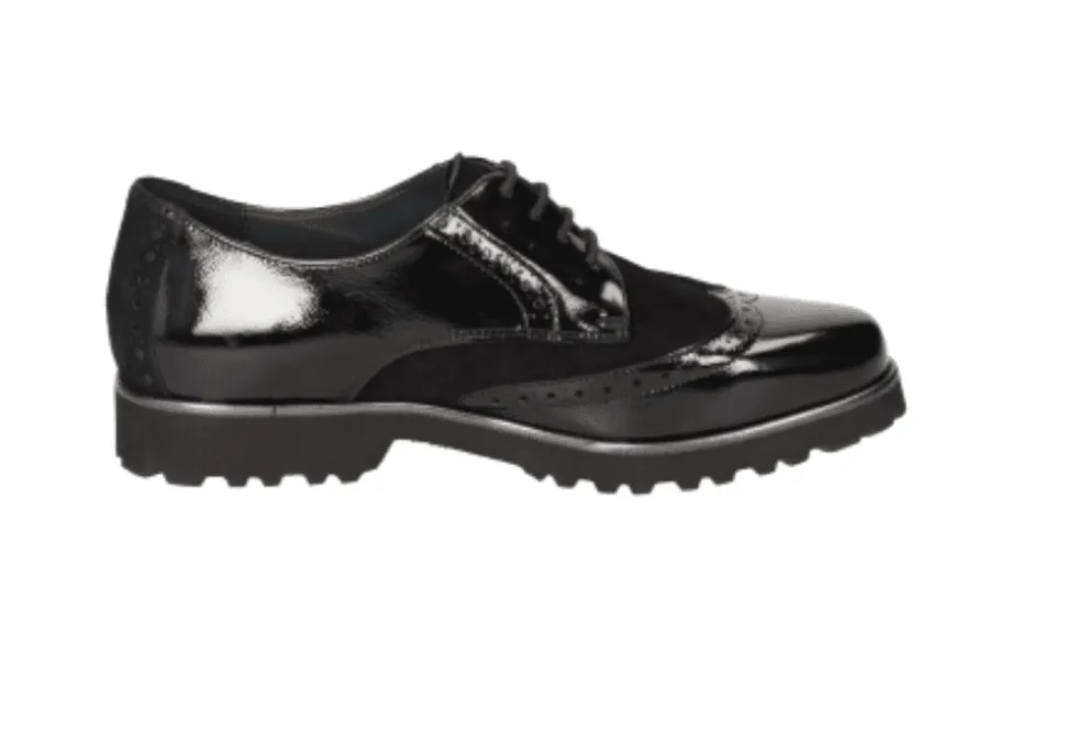 The Meredith 703Xl Is A Wide Fitting Lace Up By Sioux. Made From A Combination Of Patent And Suede Calfskin And A Stretchy Textile Section At The Front. The Meredith 703Xl Is Ideal For Hallux Valgus Suffers (Bunions). Covered Insole With Soft Cushioning Which Can Be Swapped With Own Insole.