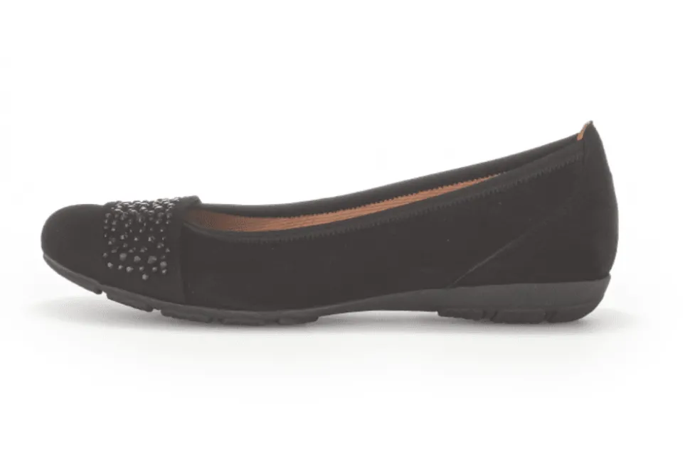 The Rae Is A Ladies Pump By Gabor. Rae Is A Comfortable Option For Those Not Wanting To Wear A Heel. These Flats Have Been Created In A Suede Leather Upper And Feature Gem Studs Across The Vamp. The Rae Is Great For A Formal Or Casual Event. The Rae Is A Very Comfortable Option And Offers A Padded Footbed And A Stretchy Top.