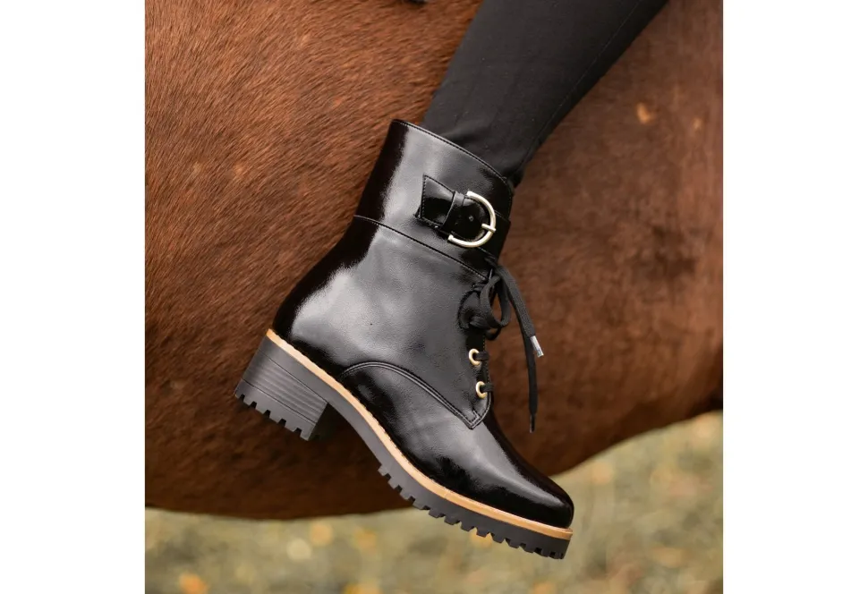 The Randi Is A Palmroth Ladies Ankle Boot. The Randi Features Laces And A Buckle Strap And Is Available In Vegan Friendly Black Crush Patent. The Upper Is Crafted From Synthetic All Weather Material And Is A Suitable Option For Cold And Wet Weather. The Material Has Been Crafted To Tolerate All Weathers And Is Very Easy To Take Care Of. The Sole Has Been Made From Recycled Material And Is 100% Traceable.