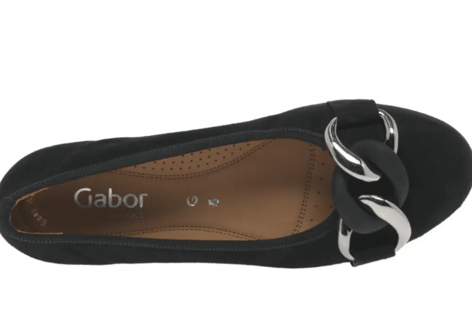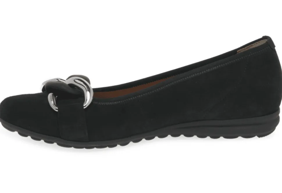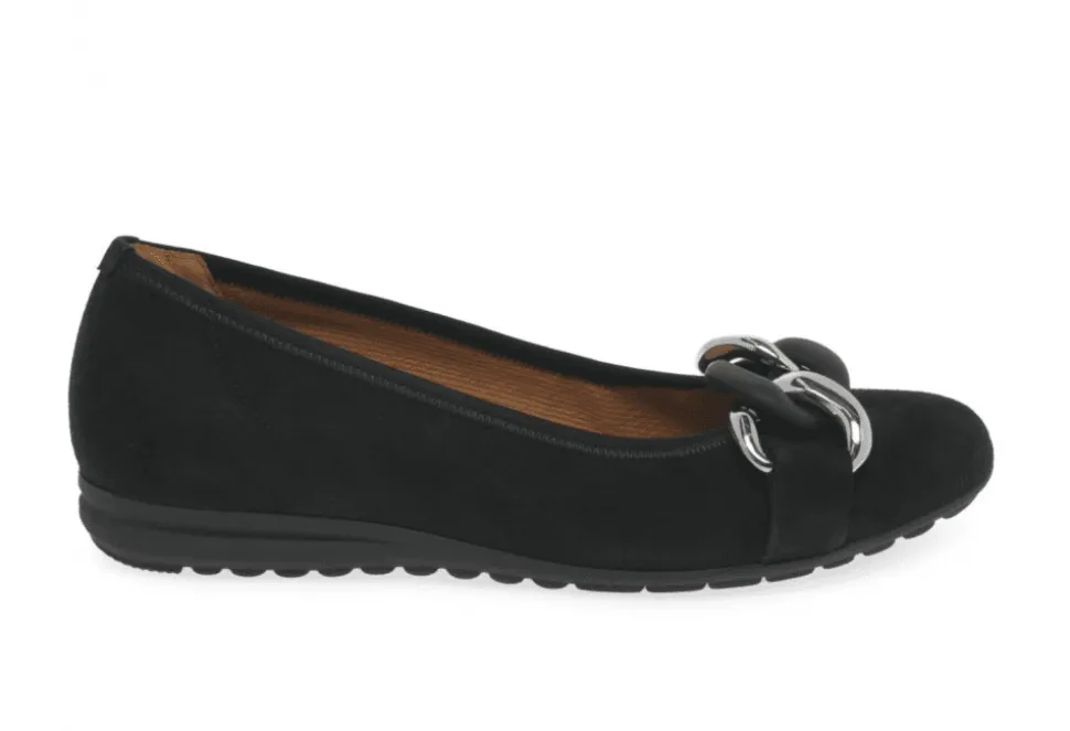 The Sabia Is A Casual Ladies Pump By Gabor. The Sabia Features A Simple Design And A Suede Leather Upper. These Stylish Pumps Feature A Soft Textile Lining And A Shock Absorbing Flat Sole. The Sabia Has Been Finished With A Sleek Chain O The Instep And Provides An On-Trend Finish To Any Outfit.